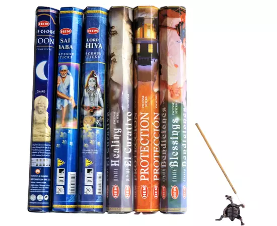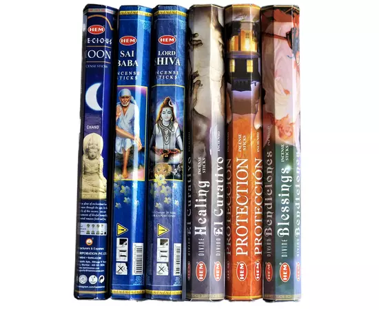 Setul mixt 120 betisoare parfumate HEM (Precious Moon, Sai Baba, Lord Shiva, Divine Healing, Protection, Divine Blessing) contine 6 arome a cate 20 betisoare parfumate fiecare. Betisoarele sunt fabricate in India.