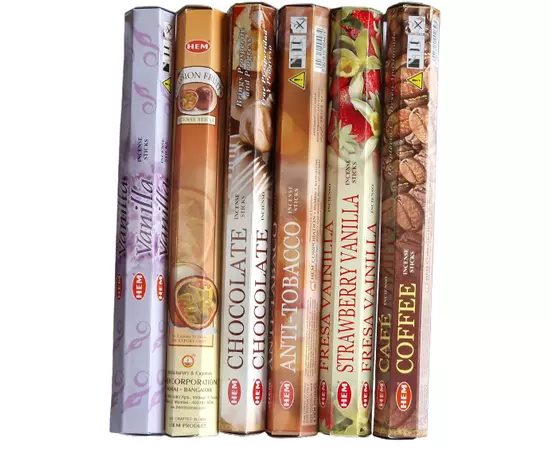 Setul mixt 120 betisoare parfumate HEM (Vanilla, Pasion Fruit, Chocolate, Anti-Tabacco, Strawberry Vanilla, Coffee ) contine 6 arome a cate 20 betisoare parfumate fiecare. Betisoarele sunt fabricate in India.