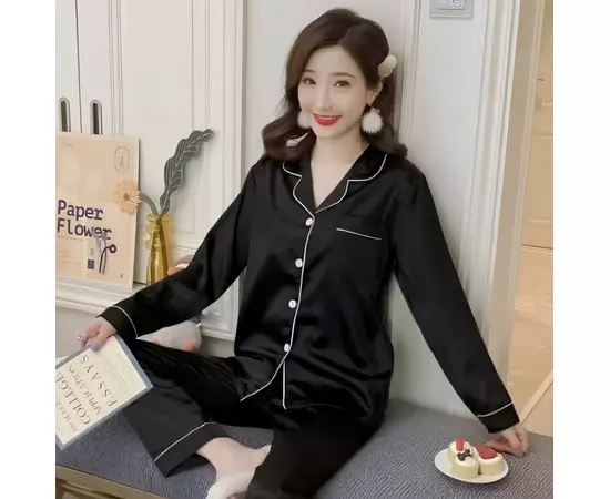 Set Pijama de Dama 2 Piese din Satin, Negru - MEI82