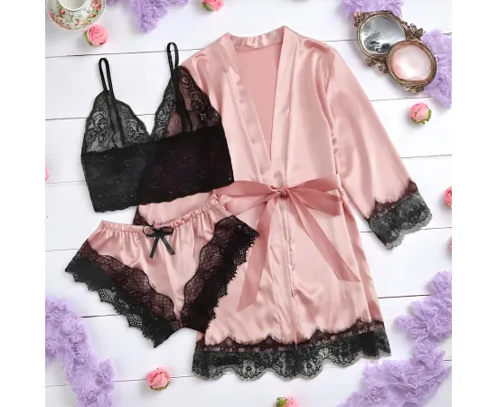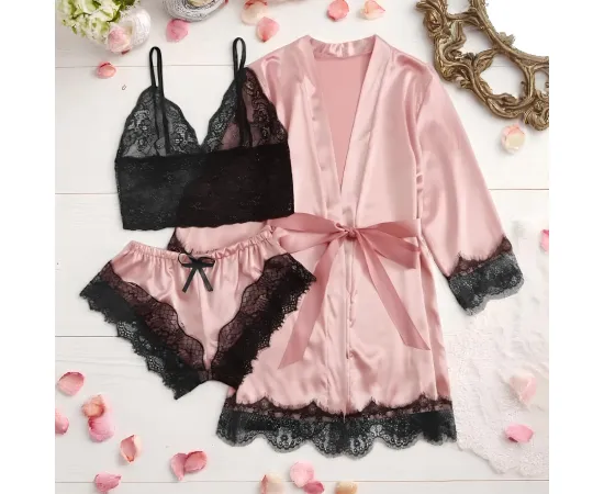 Acest set pijamă 3 piese roz pudră din satin și dantelă este ideal pentru a transforma orice seară într-un moment special de răsfăț și stil personal.