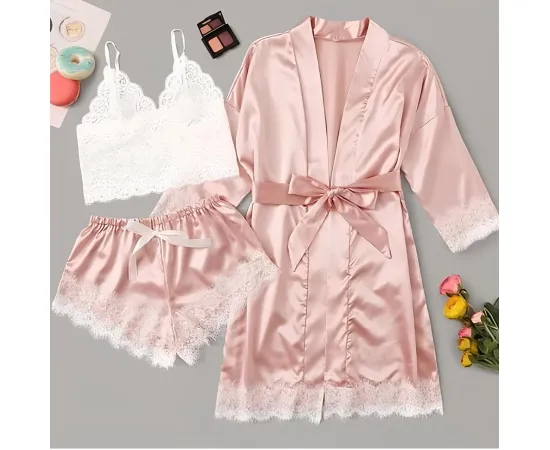 Set Pijamă de Damă 3 Piese din Satin, Culoare Somon – Delicatețe și Eleganță în Trei Piese