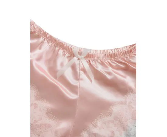 Acest set 3 piese din satin culoare somon, cu detalii delicate de dantelă, este alegerea ideală pentru serile în care vrei să te simți frumoasă, confortabilă și încrezătoare.