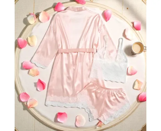 Set Pijamă de Damă 3 Piese din Satin, Culoare Somon – Delicatețe și Eleganță în Trei Piese