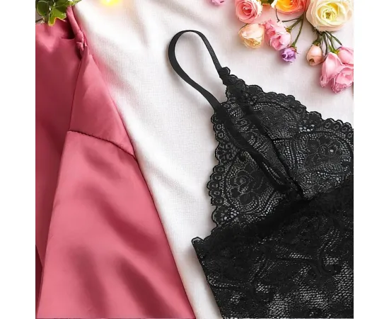 Acest set de pijamă 3 piese din satin cu maiou din dantelă este expresia perfectă a feminității moderne – elegant, versatil și irezistibil de confortabil.