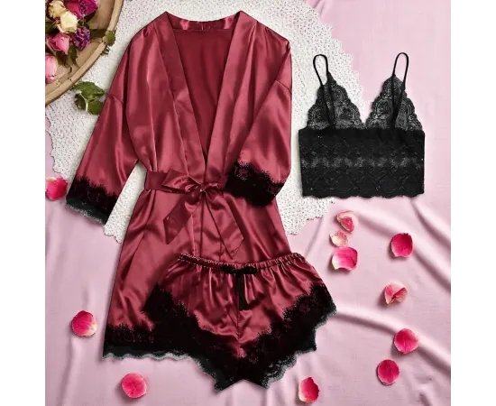 Simte-te răsfățată și elegantă chiar și în momentele de relaxare cu acest set de pijamă 3 piese din satin vișiniu, format dintr-un maiou delicat cu inserții de dantelă, pantaloni scurți comozi și un halat asortat cu cordon în talie. Un mix perfect între confort și senzualitate.