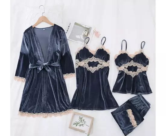 Set Pijama De Dama 4 Piese Gri Petrol Din Catifea- MEI14