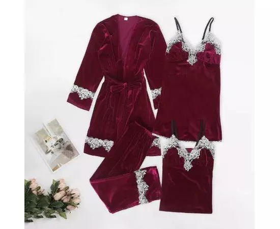 Set Pijama de Dama 4 Piese din Catifea, Visiniu