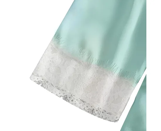 Descoperă combinația perfectă între rafinament și confort cu acest set de pijamă 4 piese din satin turcoaz, ideal pentru seri relaxante sau dimineți liniștite. Setul conține un halat elegant cu cordon, un maiou feminin cu detalii din dantelă, pantaloni scurți lejeri și un chilot delicat din dantelă, toate armonizate într-o nuanță proaspătă de turcoaz.
