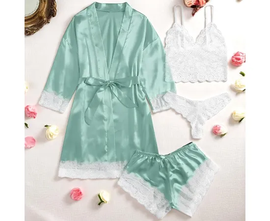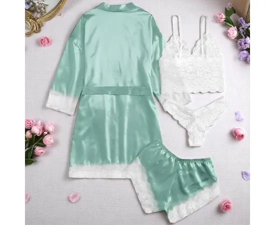 Set Pijama de Dama 4 Piese din Satin, Culoare Turcoaz - ANI115