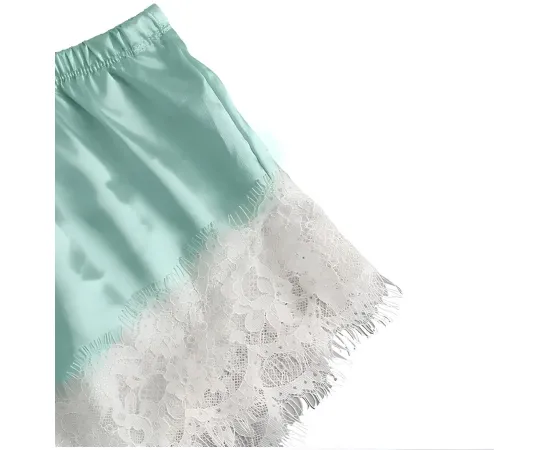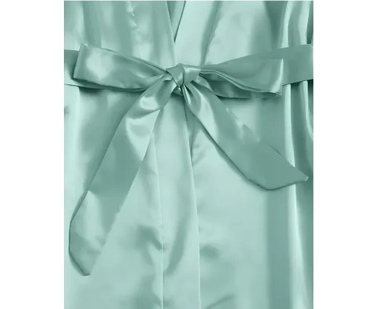 Descoperă combinația perfectă între rafinament și confort cu acest set de pijamă 4 piese din satin turcoaz, ideal pentru seri relaxante sau dimineți liniștite. Setul conține un halat elegant cu cordon, un maiou feminin cu detalii din dantelă, pantaloni scurți lejeri și un chilot delicat din dantelă, toate armonizate într-o nuanță proaspătă de turcoaz.
