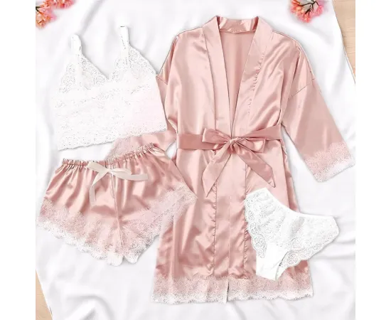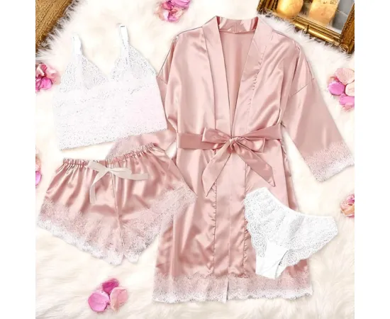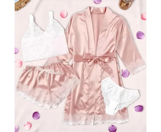 Alege eleganța și confortul în fiecare seară cu acest set pijamă 4 piese din satin roz pudră, creat special pentru a-ți evidenția feminitatea. Setul conține un halat lejer cu cordon, un maiou fin cu detalii din dantelă, pantaloni scurți comozi și un chilot delicat din dantelă, toate într-o nuanță romantică și rafinată.