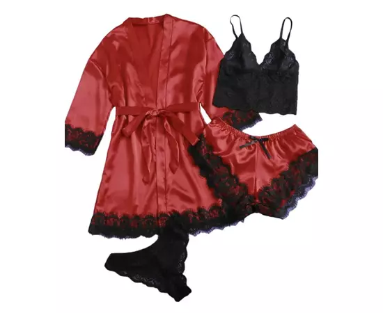 Acest set 4 piese din satin vișiniu cu dantelă este alegerea ideală pentru femeia modernă care îmbină eleganța cu confortul, zi de zi.