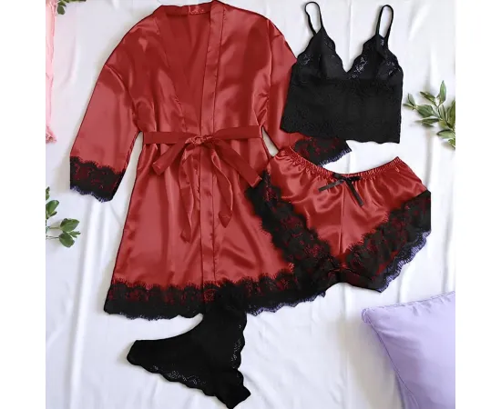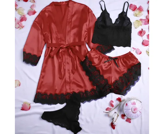 Acest set 4 piese din satin vișiniu cu dantelă este alegerea ideală pentru femeia modernă care îmbină eleganța cu confortul, zi de zi.