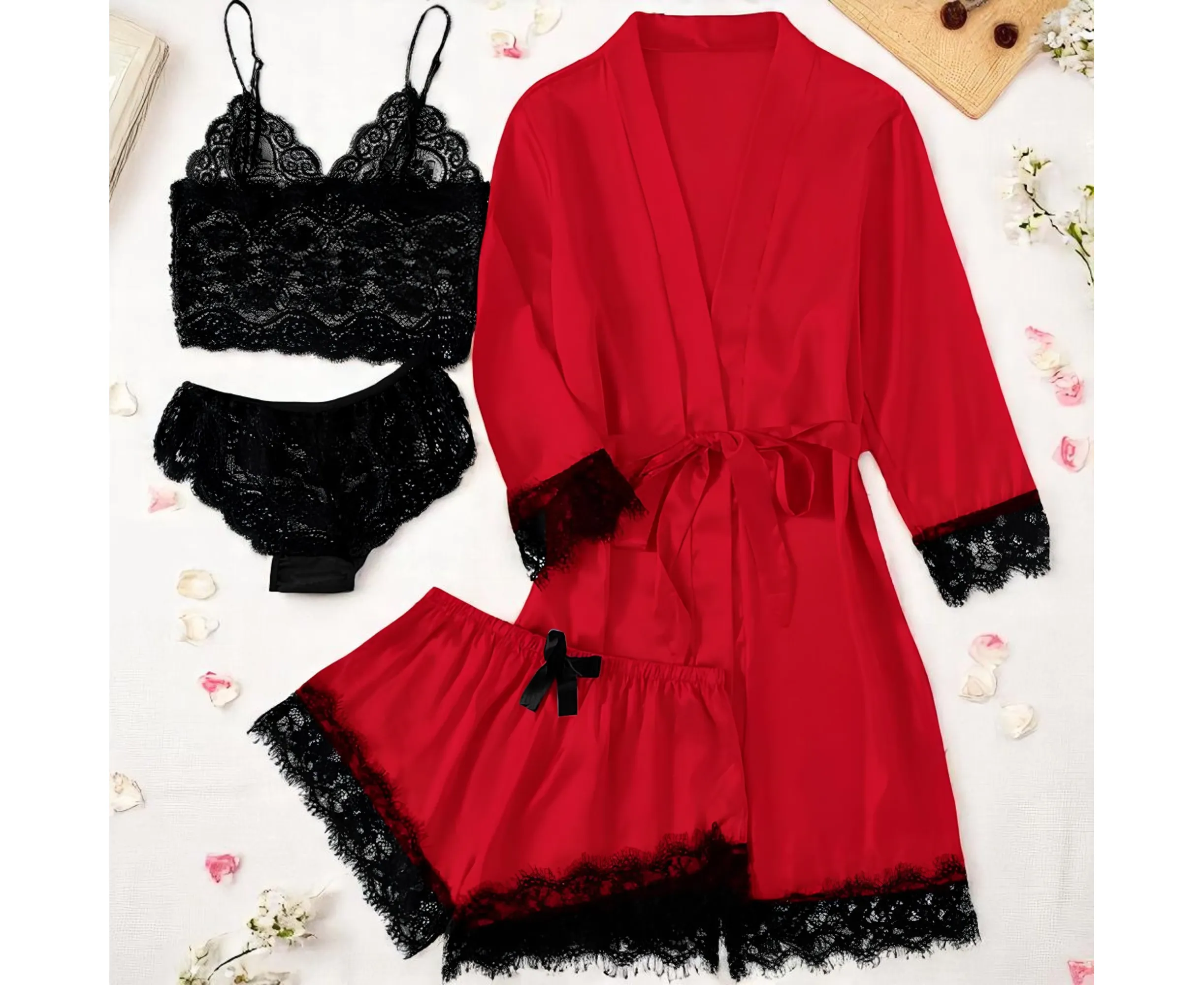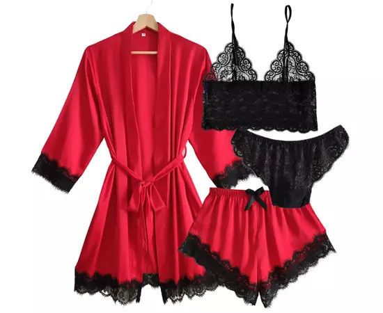 Set Pijamă de Damă 4 Piese din Satin, Culoare Roșu – Pasiune, Eleganță și Răsfăț în Fiecare Detaliu