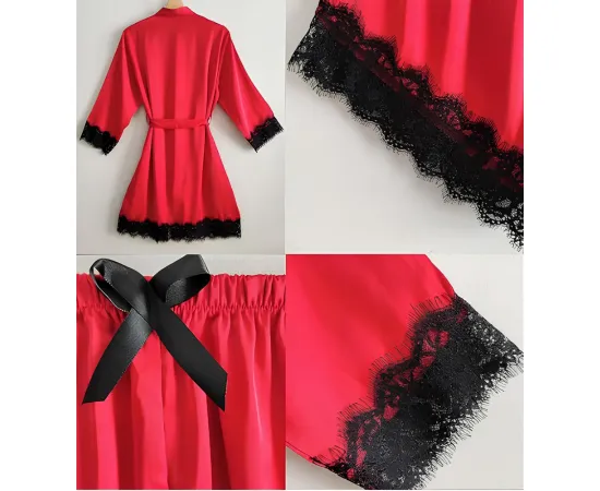 Set Pijama de Dama 4 Piese din Satin, Culoare Rosu - ANI120