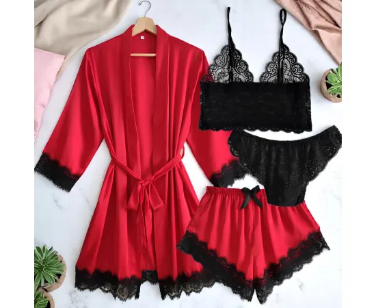 Set Pijamă de Damă 4 Piese din Satin, Culoare Roșu – Pasiune, Eleganță și Răsfăț în Fiecare Detaliu