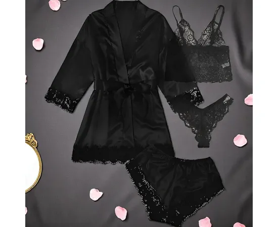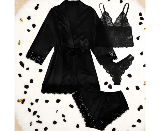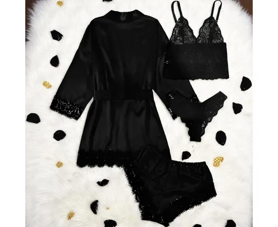 Descoperă luxul simplu și seducția clasică a acestui set pijamă 4 piese din satin negru, creat pentru a-ți oferi un look sofisticat și un confort desăvârșit. Cu un design complet, setul conține un halat elegant cu cordon, un maiou delicat cu detalii din dantelă, pantaloni scurți lejeri și un chilot din dantelă fină, toate într-o nuanță atemporală și rafinată de negru.