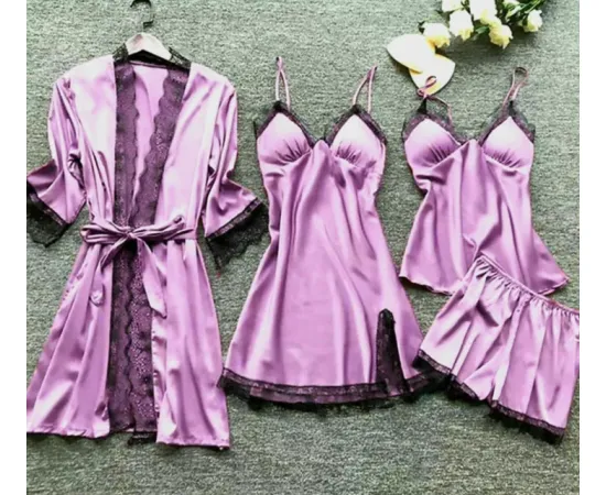 Set Pijama de Dama 4 Piese din Satin, Mov