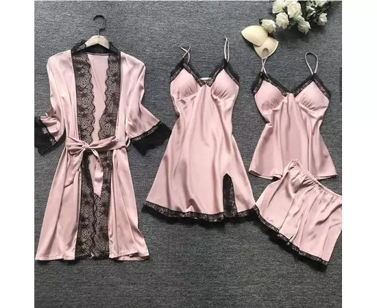 Set Pijama de Dama 4 Piese din Satin Roz Pudra