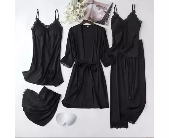 Setul de pijamale pentru dame în 5 piese, realizat din satin negru, este o expresie a rafinamentului și luxului în lumea relaxării. Cu o varietate de piese atent create, acest set oferă nu doar confortul necesar pentru un somn odihnitor, ci și o doză generoasă de eleganță.
