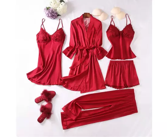 Set Pijama De Dama 5 Piese Din Satin, Rosu - ANI112