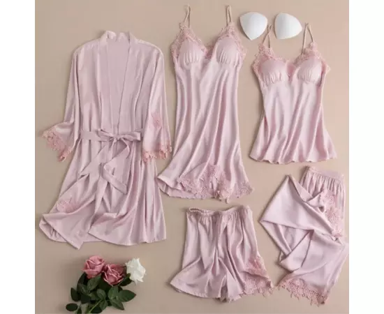 Setul de pijamale pentru dame în 5 piese, realizat din satin ROZ , este o expresie a rafinamentului și luxului în lumea relaxării. Cu o varietate de piese atent create, acest set oferă nu doar confortul necesar pentru un somn odihnitor, ci și o doză generoasă de eleganță.