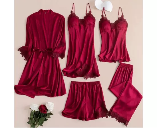 Set Pijama De Dama 5 Piese Din Satin, Bordo - ANI114