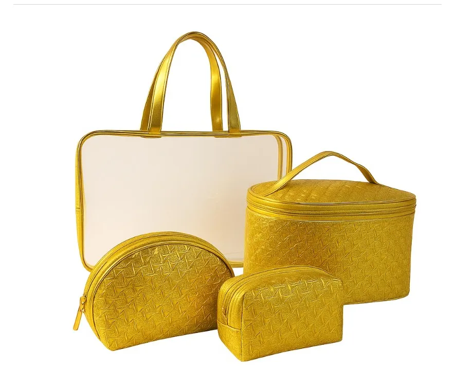 ???? Model: Design texturat matlasat cu motive geometrice și fermoar metalic; geanta mare este transparentă cu margini colorate.