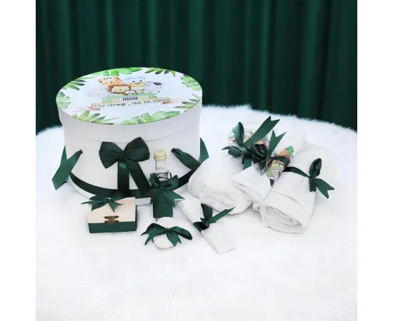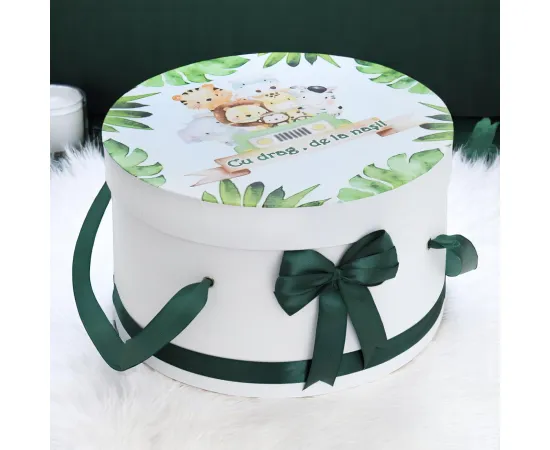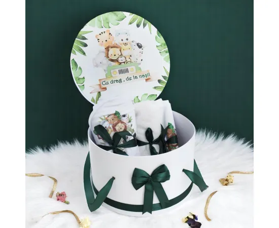 Trusou Botez cu 8 Piese Imprimat, Animale Safari, Culoare Verde Inchis - TB224