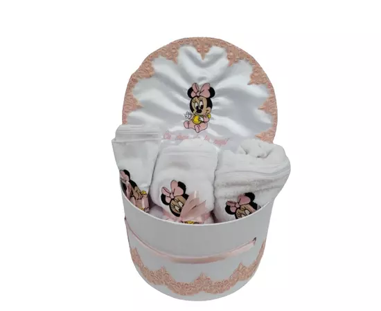 - Prosop pentru bebelus – din material moale deosebit de absorbant,din bumbac de cea mai buna calitate. Prosopul este decorat cu dantela si cu diferite mesaje. Dimensiunea prosopului este de 80 cm x 80 cm, suficient pentru a sterge bebelusul si pentru a-l tine infasurat pe parcursul ceremoniei.