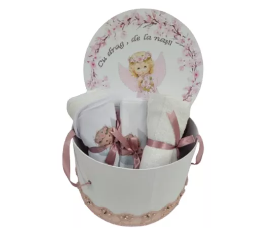 - Prosop pentru bebelus – din material moale deosebit de absorbant,din bumbac de cea mai buna calitate. Prosopul este decorat cu dantela si cu diferite mesaje. Dimensiunea prosopului este de 80 cm x 80 cm, suficient pentru a sterge bebelusul si pentru a-l tine infasurat pe parcursul ceremoniei.