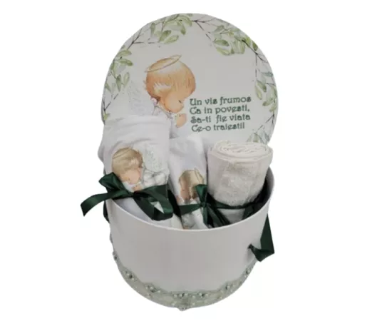 Pentru ca botezul este un eveniment important pentru parinti si nasi, venim in ajutor cu un set care contine toate cele necesare pentru crestinarea bebelusului