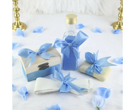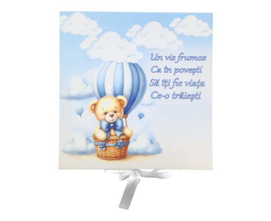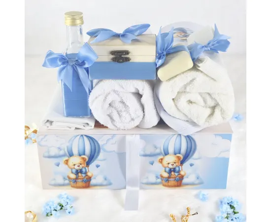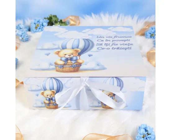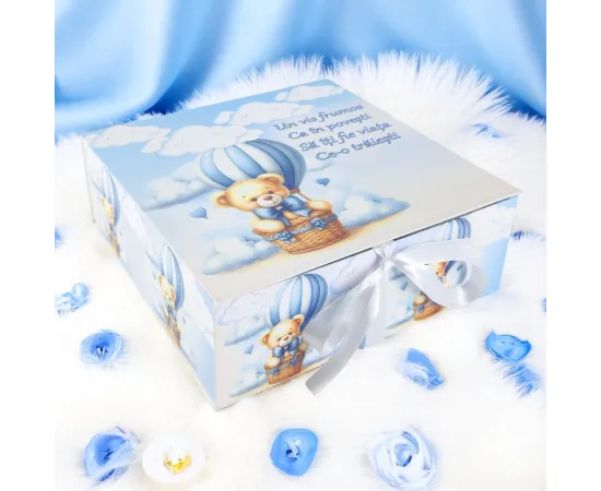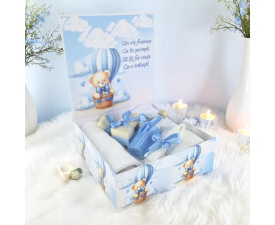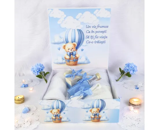 Trusou Botez cu 8 Piese, Ursulet in Balon, Culoare Albastru Deschis - TB279
