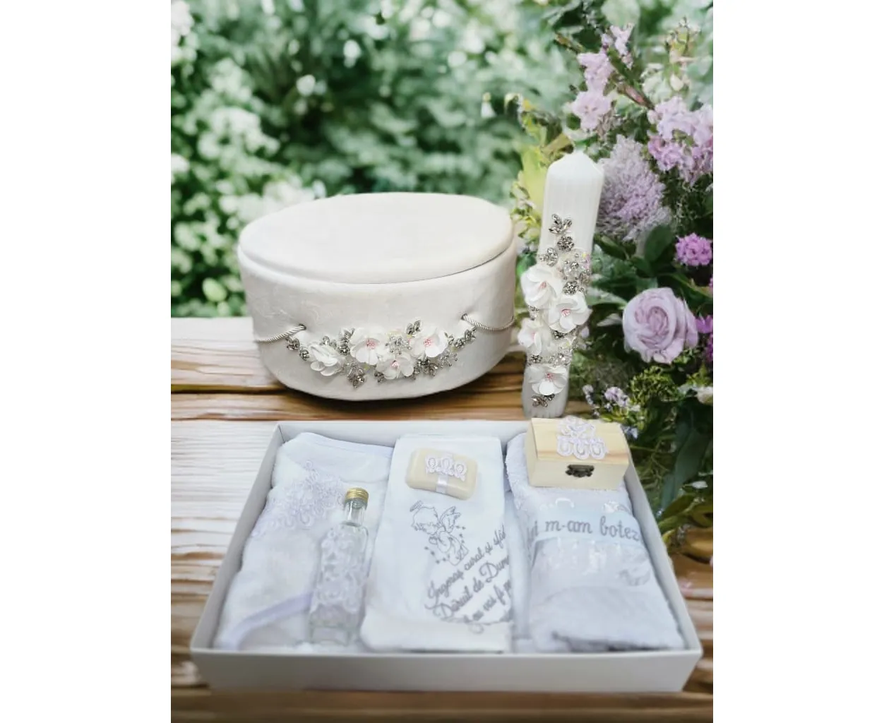 Setul pentru Botez contine Cutia din catifea cu toate piesele trusoului si Lumanarea - set minunat și grijuliu creat special pentru a marca momentul unic al botezului unui copil. Fiecare element al acestui trusou este atent selectat pentru a reflecta bucuria, caldura și binecuvântarea acestui eveniment sacru. Iată o posibilă descriere:
