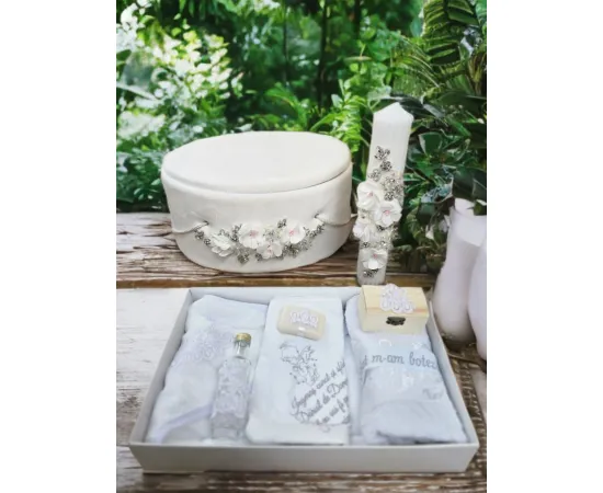 Set Trusou Botez si Lumanare, 9 Piese, cu Flori, Alb, din Catifea - TB292