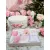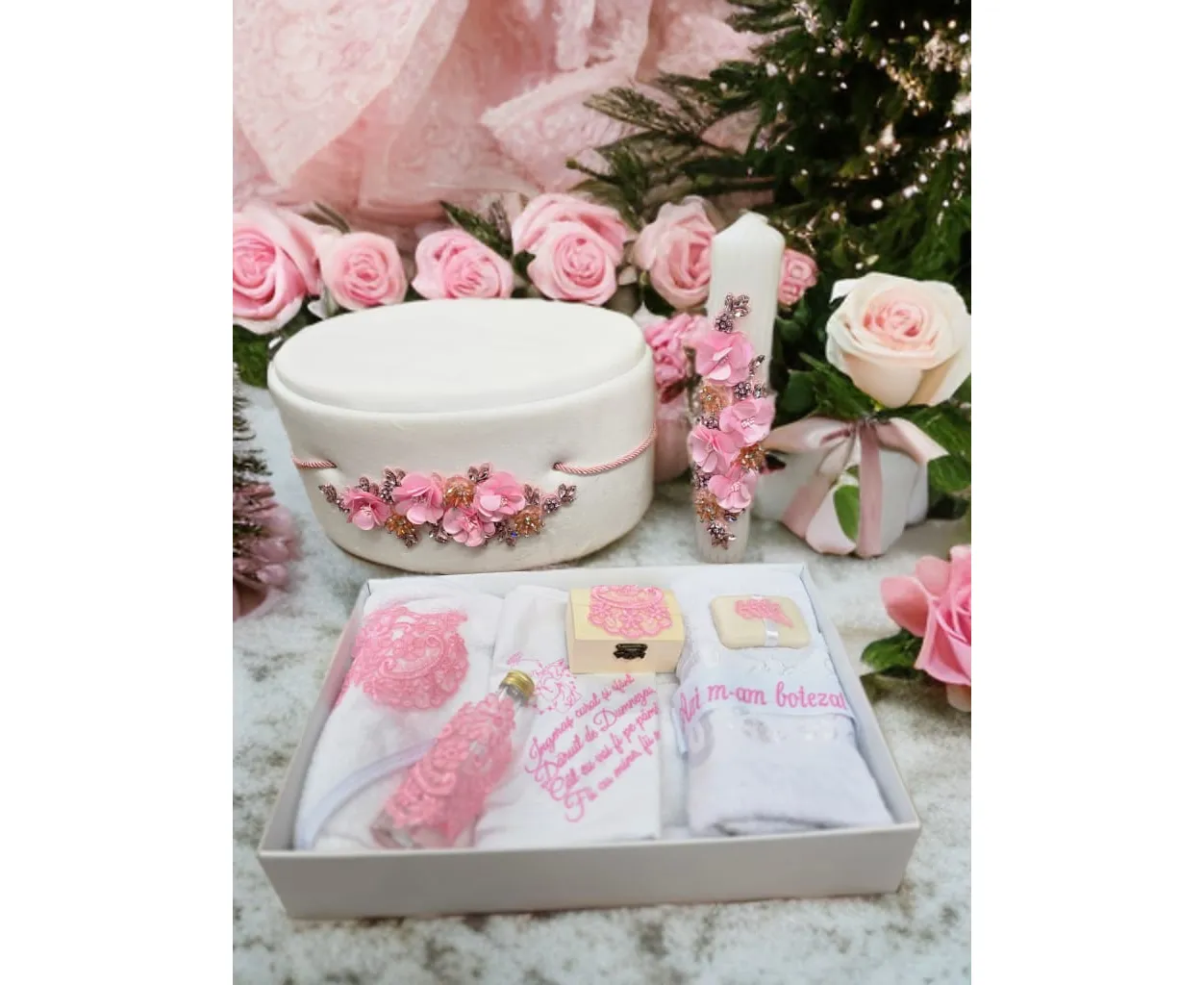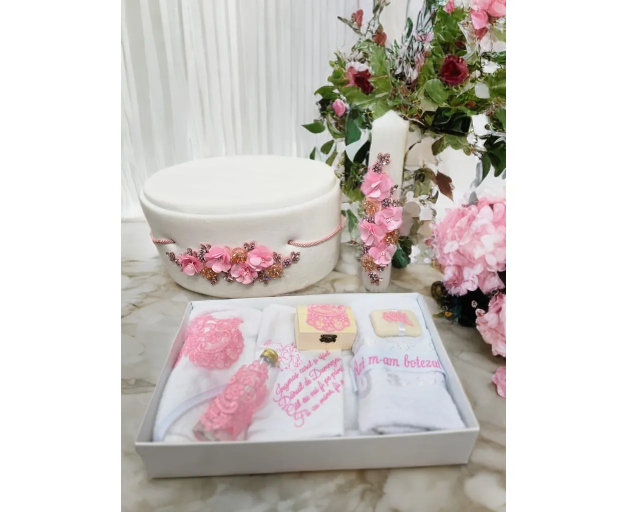 Set Trusou Botez si Lumanare, 9 Piese, cu Flori, Alb si Roz, din Catifea - TB289