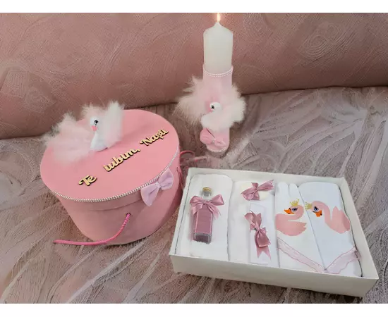 Set Trusou Botez si Lumanare, 9 Piese, cu Lebada, Alb si Roz, din Catifea - TB254