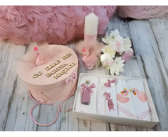 Set Trusou Botez si Lumanare, 9 Piese, cu Lebada, Roz, din Catifea - TB248
