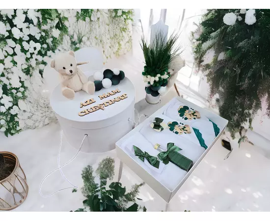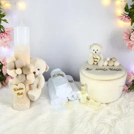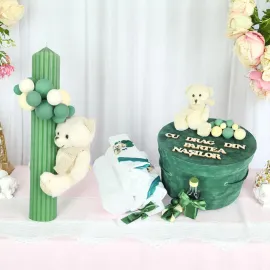 Set Trusou Botez si Lumanare, 9 Piese, cu Ursulet, Alb si Verde, din Catifea - TB250