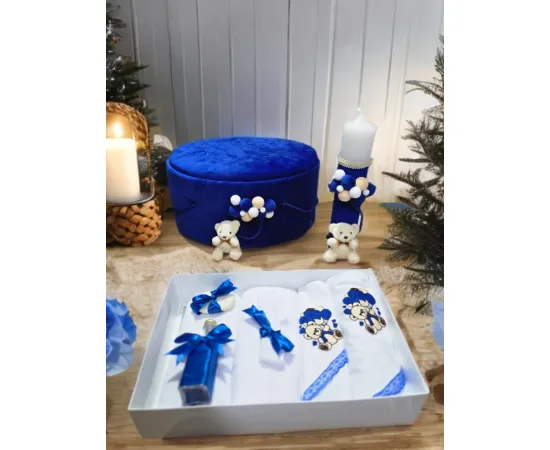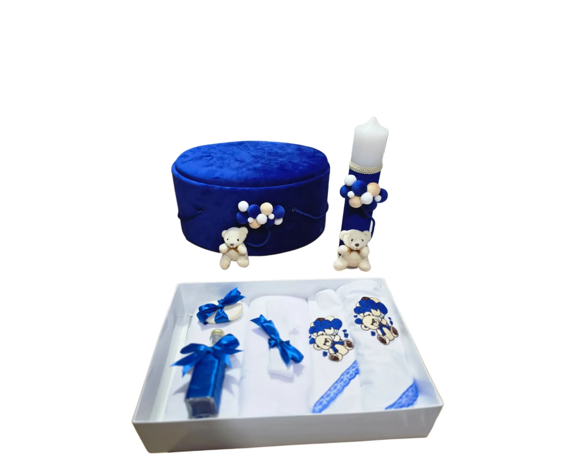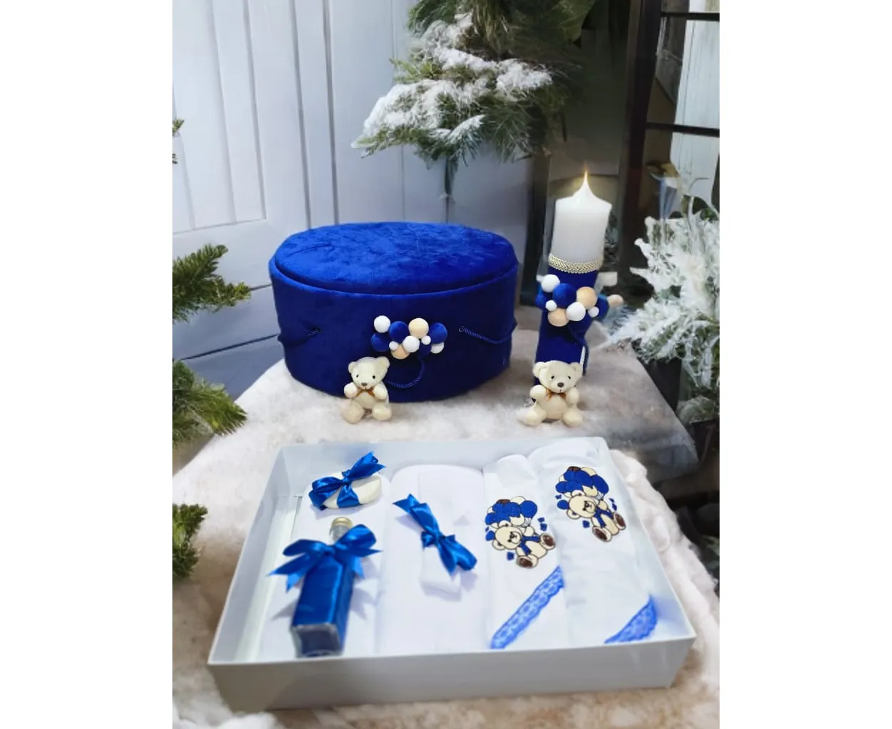 Set Trusou Botez si Lumanare, 9 Piese, cu Ursulet, Albstru, din Catifea - TB283