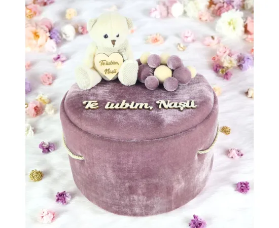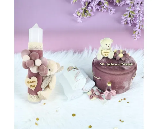 Set Trusou Botez si Lumanare, 9 Piese, cu Ursulet, Burgundy, din Catifea - TB241