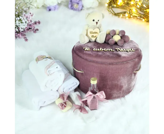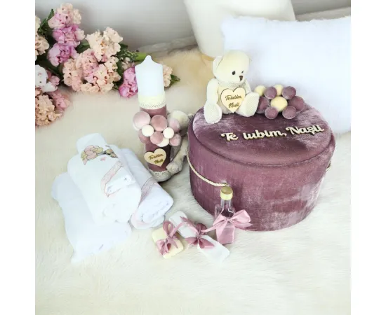 Setul pentru Botez contine Cutia din catifea cu toate piesele trusoului si Lumanarea - set minunat și grijuliu creat special pentru a marca momentul unic al botezului unui copil. Fiecare element al acestui trusou este atent selectat pentru a reflecta bucuria, caldura și binecuvântarea acestui eveniment sacru. Iată o posibilă descriere: