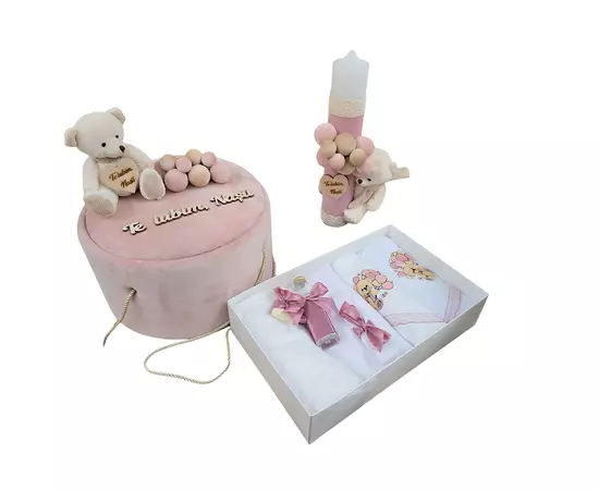 Set Trusou Botez si Lumanare, 9 Piese, cu Ursulet, Roz Pudra, din Catifea - TB246