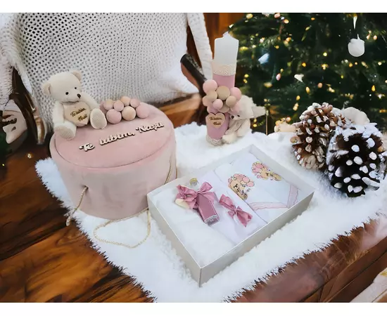 Setul pentru Botez contine Cutia din catifea cu toate piesele trusoului si Lumanarea - set minunat și grijuliu creat special pentru a marca momentul unic al botezului unui copil. Fiecare element al acestui trusou este atent selectat pentru a reflecta bucuria, caldura și binecuvântarea acestui eveniment sacru. Iată o posibilă descriere: