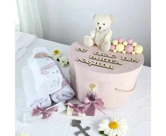 Setul pentru Botez contine Cutia din catifea cu toate piesele trusoului si Lumanarea - set minunat și grijuliu creat special pentru a marca momentul unic al botezului unui copil. Fiecare element al acestui trusou este atent selectat pentru a reflecta bucuria, caldura și binecuvântarea acestui eveniment sacru. Iată o posibilă descriere: