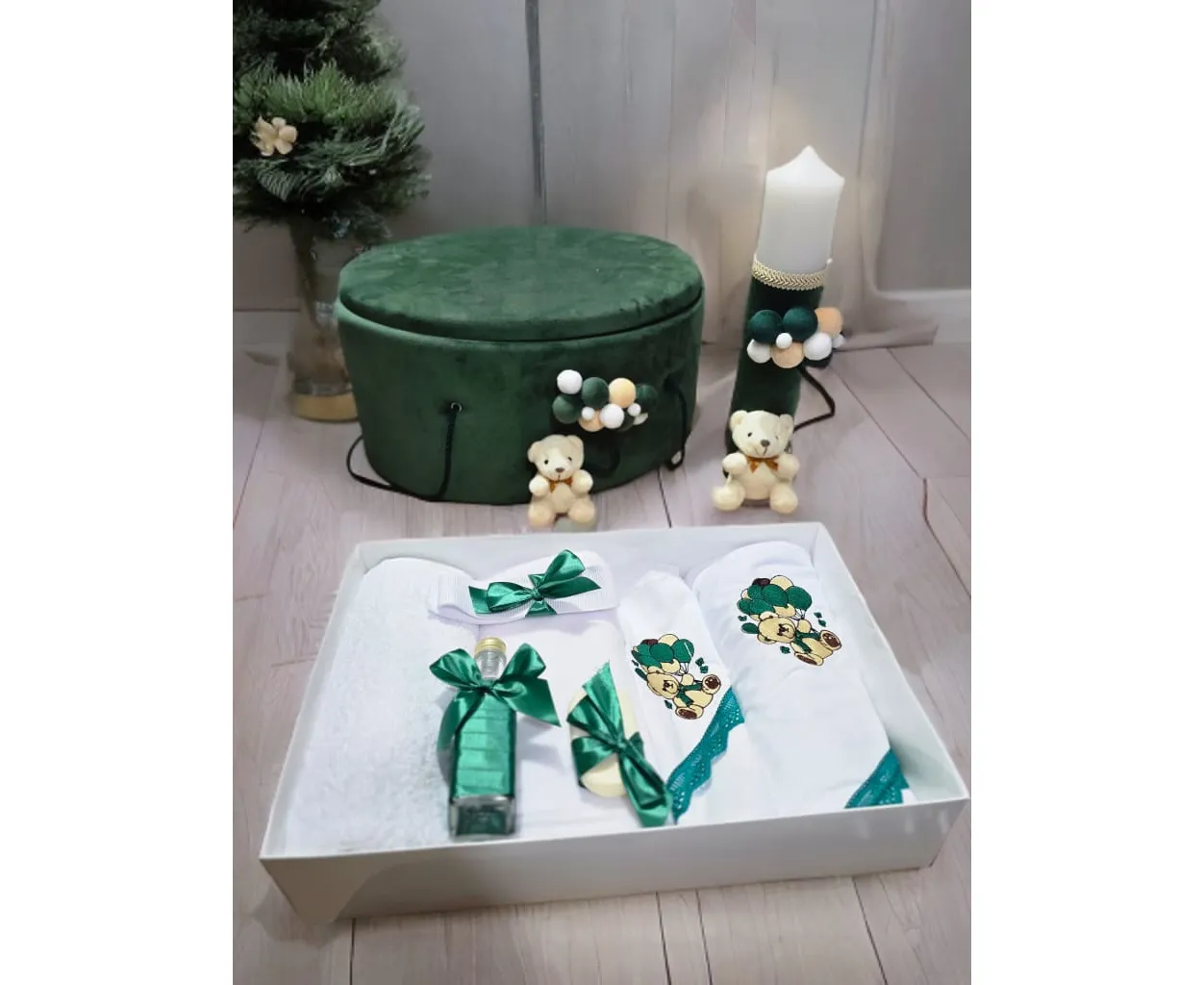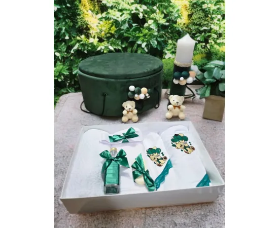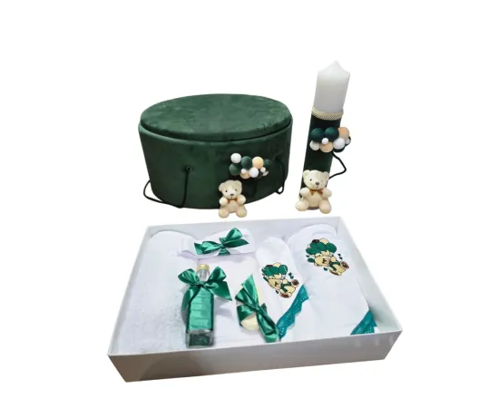 Set Trusou Botez si Lumanare, 9 Piese, cu Ursulet, Verde Regal, din Catifea - TB282