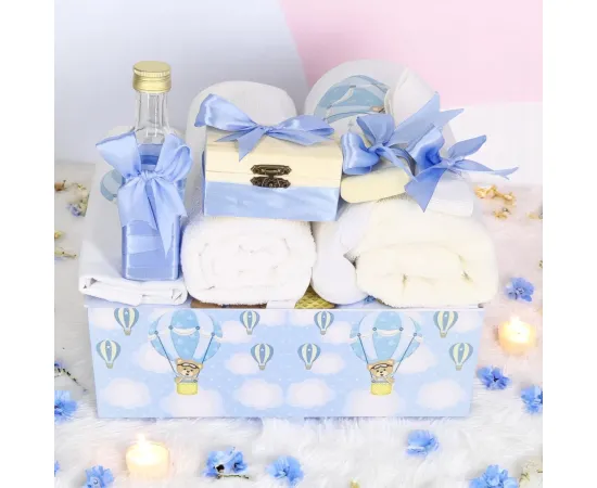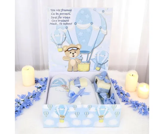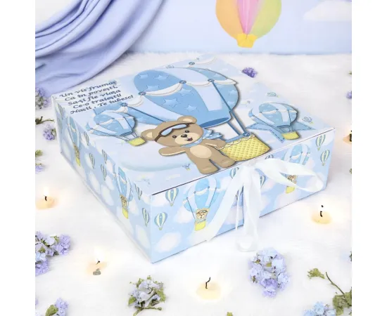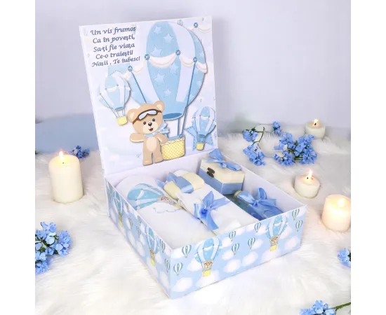 Trusou Botez cu 8 Piese, Ursulet cu Balon, Culoare Albastru Deschis - TB188