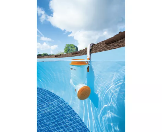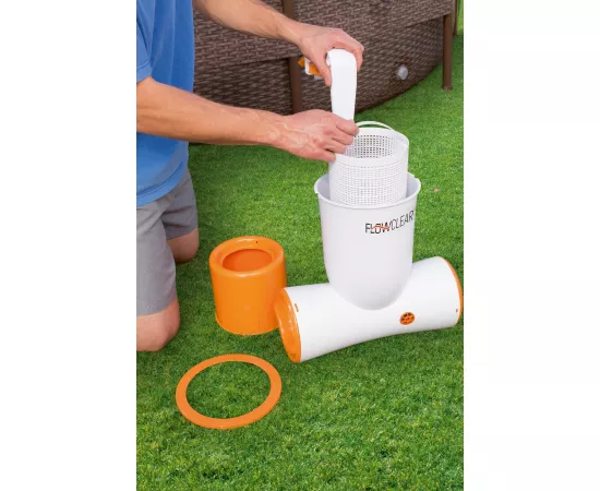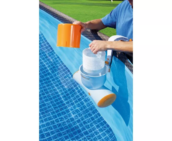 Pompa de filtrare are o capacitate de 2574 litri pe ora . Rezervorul mare va atrage inauntru frunzele plutitoare si alte resturi in timp ce filtreaza si curata automat apa.