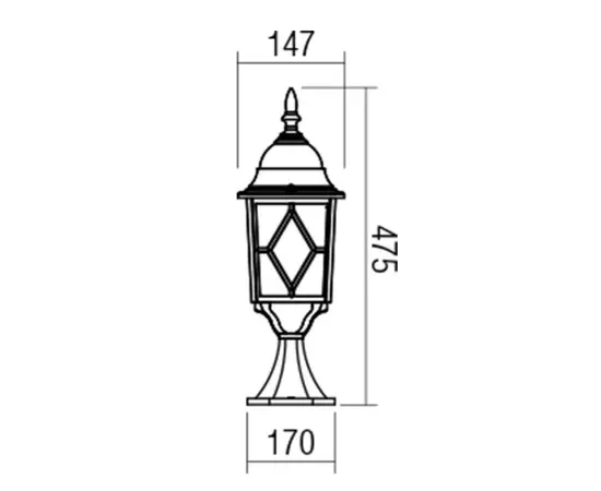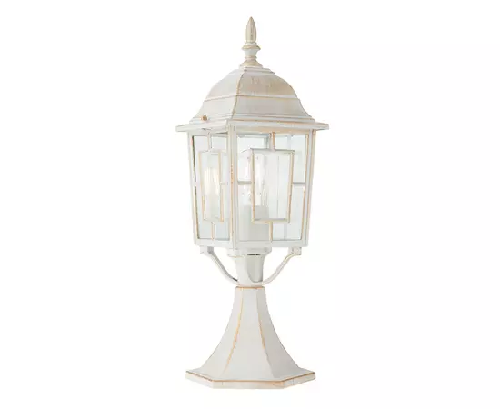 Este un corp pentru exterior cu structura din aluminiu turnat, finisaj alb mat cu patina aurie si dispersoare din sticla transparenta. Acesta are o rezistenta sporita la factorii atmosferici, avand un grad de protectie de IP44. Dimensiunile produsului sunt: 475 x 147 mm (inaltime x latime).