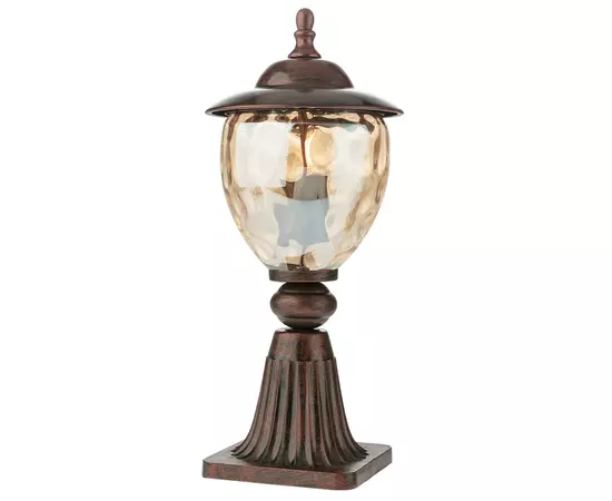 Este un corp de iluminat pentru exterior, cu structura din metal finisat negru cu patina cupru si dispersor din sticla tip „water glass'' de culoare cognac. Gradul de protectie la corpuri solide si lichide, de IP33, ii ofera o rezistenta sporita.